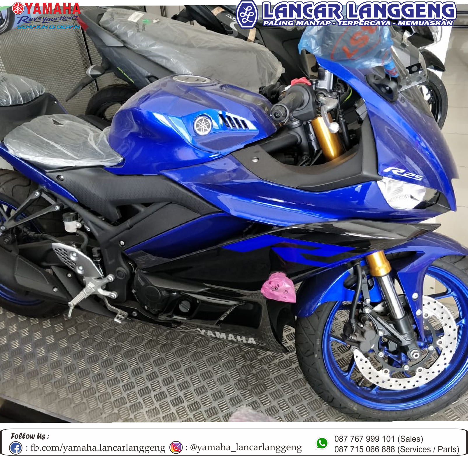 Motor Yamaha YZF-R25 di Yamaha Lancar Langgeng hadir dengan desain terbaru dan fitur fitur andalan. Mendambakan motor sport yang nyaman, cepat dan stabil saat digunakan ini adalah waktunya kamu memiliki Yamaha YZF-R25. Dengan kelebihan yang dimiliki Yamaha YZF-R25 menjadi produk andalan Yamaha. Selain itu Yamaha YZF-R25 juga memiliki empat pilihan warna yaitu Racing Blue, Matte Black, Matte Red and Monster Livery yang menjadikan motor ini terihat lebih macho dan keren. Karena dengan harga yang tergolong murah dikelasnya Yamaha YZF-R25 menjadi idaman para pecinta motor sport 250cc & 2 silinder.